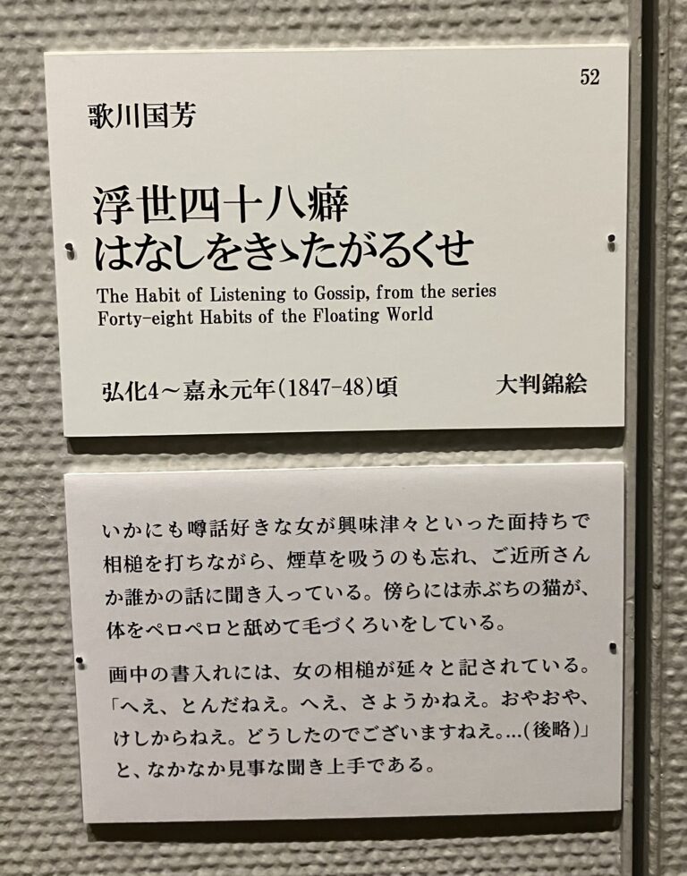 浮世絵って版画だから大量に刷られていて今でもそこそこ枚数がある?からなのか?、歌川広重や葛飾北斎といった超ビッグネームの作品も他の作品(といっても他の人達も、名前は聞いたことある=超有名な浮世絵師だったけど)としれーっと普通に並んでて面白かったし、全作品が写真撮影OKで気軽に見られる感じだった